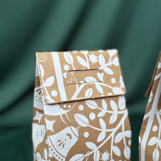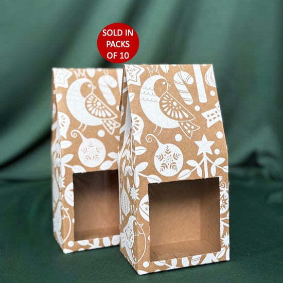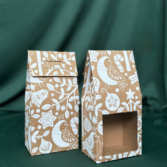 Description: Show off your coffee products with our Kraft Coffee Box with Window in the White festive forest print. Measuring 190x90x60mm, this eco-friendly box features a clear window that allows customers to see the contents while maintaining a rustic, natural look. Perfect for displaying coffee beans, grounds, or other specialty items, this sturdy box combines sustainability with style. Available in a pack of 10, itโs an ideal packaging solution for coffee shops, retailers, or as a thoughtful gift option.
