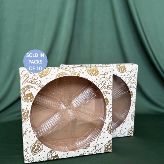 Description: Elevate your festive packaging with these elegant white peanut wheels featuring the Gold Eid Radiance design. Perfect for presenting sweets, small treats, or thoughtful gifts, they add a refined touch to Eid celebrations, events, or retail displays.